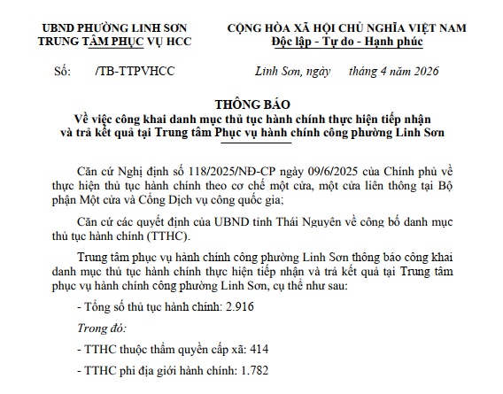Thông báo về việc công khai danh mục thủ tục hành chính thực hiện tiếp nhận và trả kết quả tại Trung tâm Phục vụ hành chính công phường Linh Sơn.
